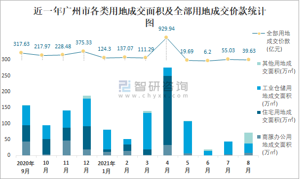 近一年廣州市各類用地成交面積及全部用地成交價款統計圖