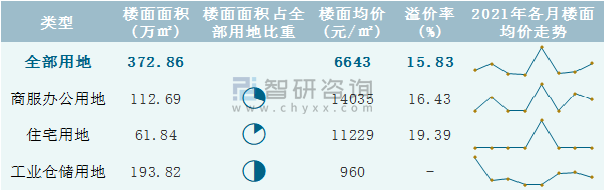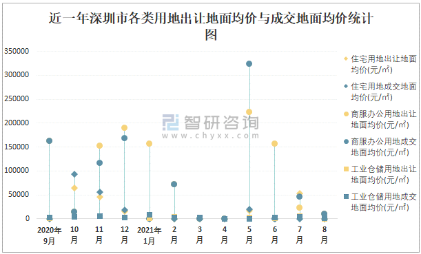 根據國信房地產信息網數據統計可知:2021年8月深圳市全部用地出讓地面均價為6941元/㎡,其中商服辦公用地出讓地面均價最高(9213元/㎡),全部用地成交地面均價為6832元/㎡;2021年1-8月深圳市工業倉儲用地樓面面積占其全部用地比重最多,為51.98%,樓面均價960元/㎡。