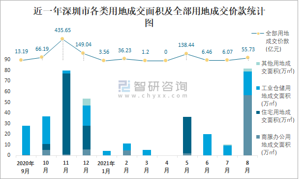 近一年深圳市各類用地成交面積及全部用地成交價款統計圖