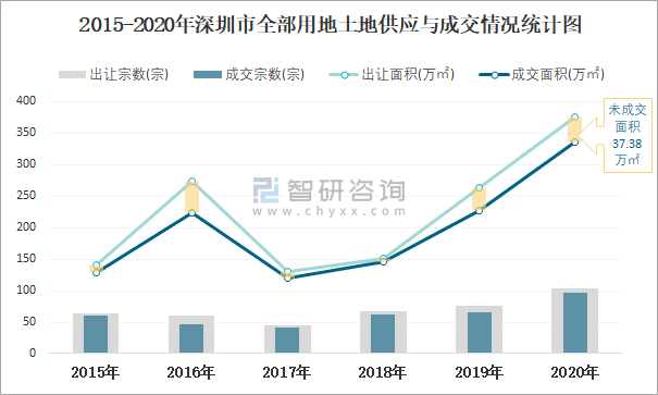 2015-2020年深圳市全部用地土地供應與成交情況統計圖