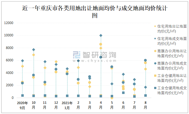 近一年重慶市各類(lèi)用地出讓地面均價(jià)與成交地面均價(jià)統(tǒng)計(jì)圖