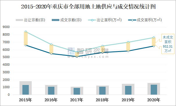 2015-2020年重慶市全部用地土地供應(yīng)與成交情況統(tǒng)計(jì)圖