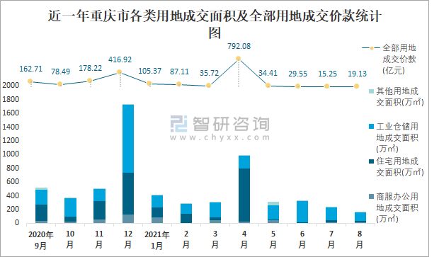 近一年重慶市各類(lèi)用地成交面積及全部用地成交價(jià)款統(tǒng)計(jì)圖