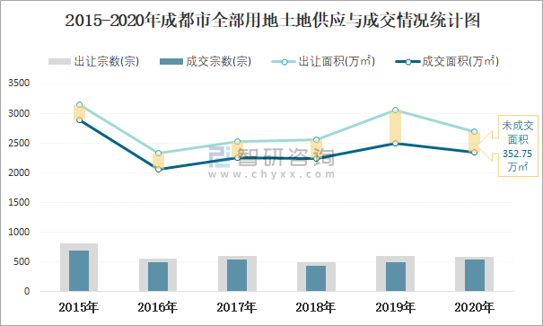 2015-2020年成都市全部用地土地供應與成交情況統計圖