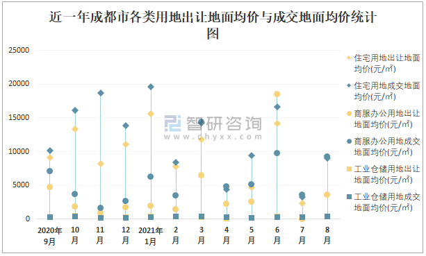 近一年成都市各類用地出讓地面均價與成交地面均價統計圖