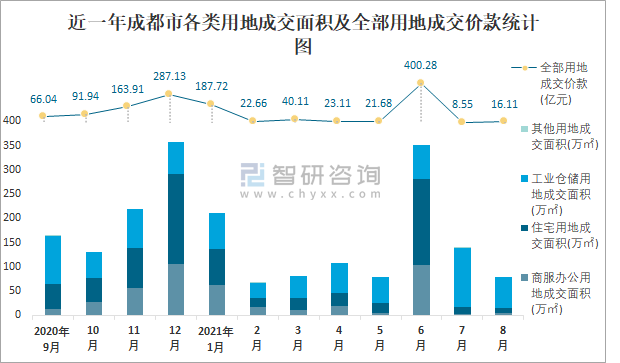 近一年成都市各類用地成交面積及全部用地成交價款統計圖