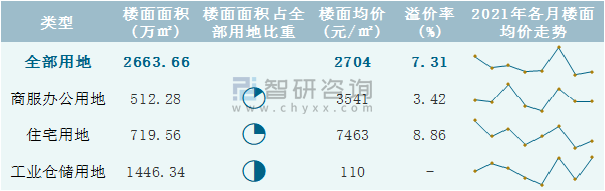 根據國信房地產信息網數據統計可知:2021年8月成都市全部用地出讓地面均價為3008元/㎡,其中住宅用地出讓地面均價最高(9298元/㎡),全部用地成交地面均價為2062元/㎡,其中住宅用地成交地面均價為9045元/㎡,低于商服辦公用地成交地面均價;2021年1-8月成都市工業倉儲用地樓面面積占其全部用地比重最多,為54.3%,樓面均價為110元/㎡。