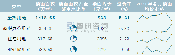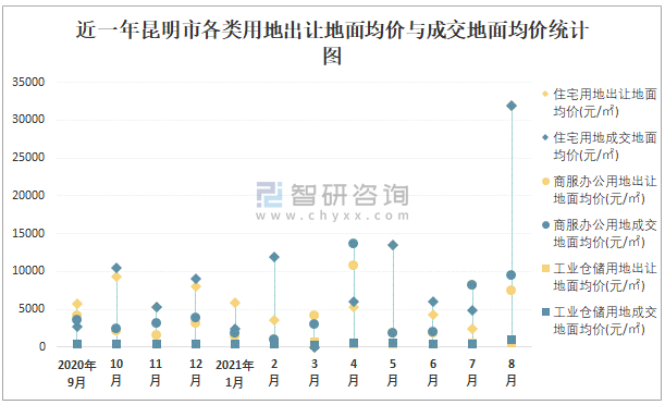 根據國信房地產信息網數據統計可知:2021年8月昆明市全部用地出讓地面均價為889元/㎡,其中住宅用地出讓地面均價最高(31891元/㎡),全部用地成交地面均價為1160元/㎡,其中住宅用地成交地面均價為31891元/㎡,高于商服辦公用地成交地面均價;2021年1-8月昆明市工業倉儲用地樓面面積占其全部用地比重最多,為37.54%,溢價率為10.59%。