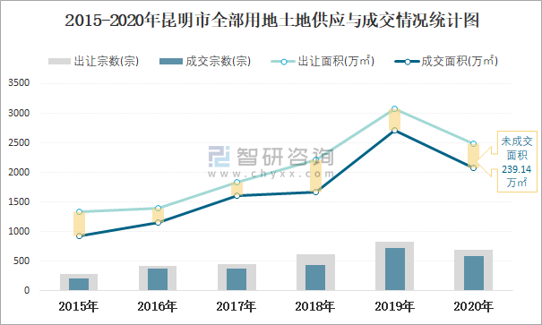 2015-2020年昆明市全部用地土地供應與成交情況統計圖