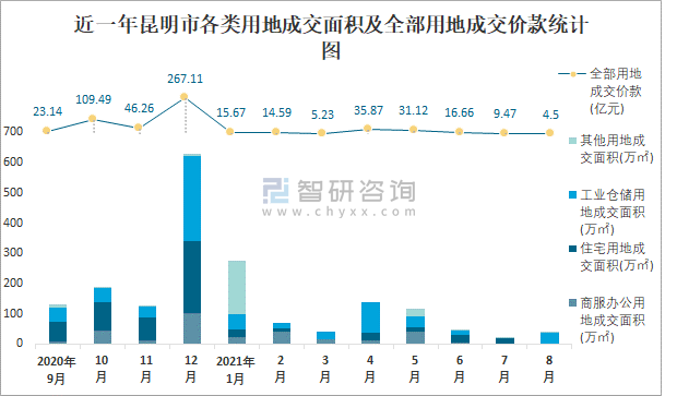 近一年昆明市各類用地成交面積及全部用地成交價款統計圖