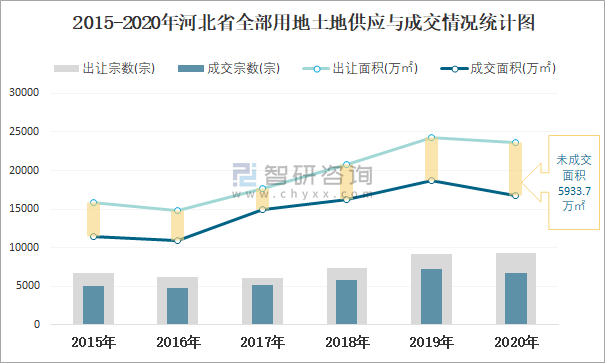 2015-2020年河北省全部用地土地供應與成交情況統計圖