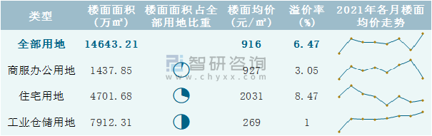 根據國信房地產信息網數據統計可知:2021年8月河北省全部用地出讓地面均價為1998元/㎡,其中住宅用地出讓地面均價最高(4554元/㎡),全部用地成交地面均價為2426元/㎡,其中住宅用地成交地面均價為4857元/㎡,高于商服辦公用地成交地面均價;2021年1-8月河北省工業倉儲用地樓面面積占其全部用地比重最多,為54.03%,溢價率為1%。