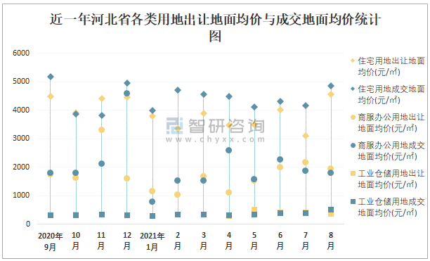 近一年河北省各類用地出讓地面均價與成交地面均價統計圖