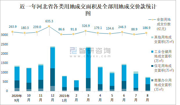 近一年河北省各類用地成交面積及全部用地成交價款統計圖