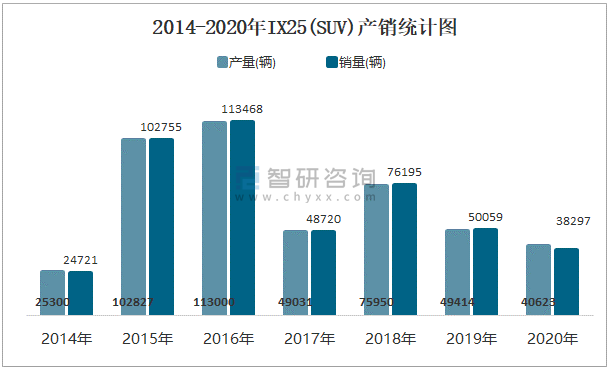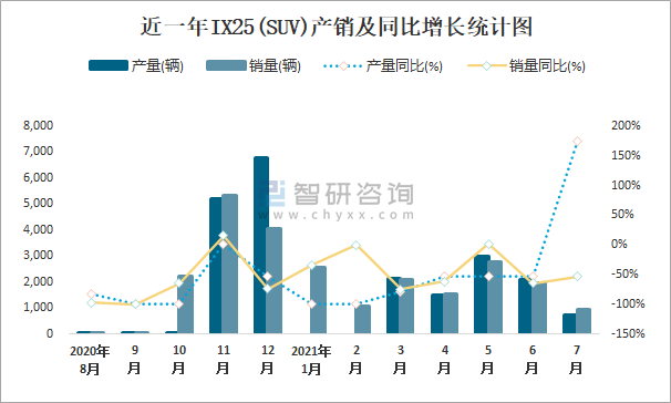 根據中國汽車工業協會數據可知:2021年7月IX25(SUV)產量為743輛,同比增長175.2%,銷量為963輛,同比下降53.2%,當月產銷率為129.61%;2021年1-7月IX25(SUV)累計產量為9495輛,同比下降66.9%,累計銷量為12997輛,同比下降51.1%,累計產銷率為136.88%;2014-2020年IX25(SUV)產銷量均在2016年達到最高值,此后總體呈現下降趨勢,且近7年總產量大于總銷量,積壓了庫存1930輛。