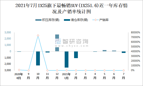 根據中國汽車工業協會數據統計可知:2021年7月IX25(SUV)旗下只有1款IX251.6SUV在銷售;近一年IX251.6共清倉庫存3238輛,其產銷率存在一定幅度波動,2020年10月產銷率最高(73900%),清倉庫存2214輛,2020年12月產銷率偏低(60.11%),積壓庫存2699輛。