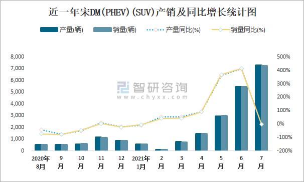 近一年宋DM(PHEV)(SUV)產銷及同比增長統計圖