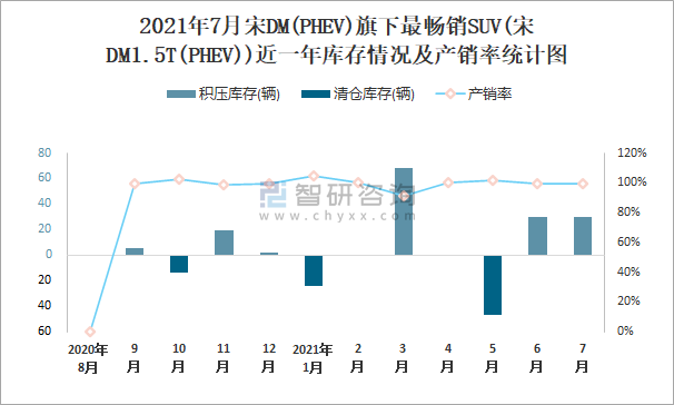 2021年7月宋DM(PHEV)旗下最暢銷SUV(宋DM1.5T(PHEV))近一年庫存情況及產銷率統計圖