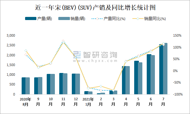 根據中國汽車工業協會數據可知:2021年7月宋(BEV)(SUV)產量為2537輛,同比增長112.3%,銷量為2605輛,同比增長117.5%,當月產銷率為102.68%;2021年1-7月宋(BEV)(SUV)累計產量為8044輛,同比增長34.1%,累計銷量為8010輛,同比增長33.7%,累計產銷率為99.58%;2017-2020年宋(BEV)(SUV)產銷量逐年遞增,且近4年總產量大于總銷量,積壓了庫存16輛。