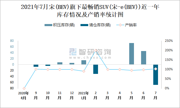 2021年7月宋(BEV)旗下最暢銷SUV(宋-e(BEV))近一年庫存情況及產銷率統計圖