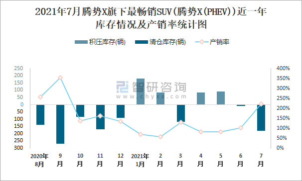 2021年7月騰勢(shì)X旗下最暢銷SUV(騰勢(shì)X(PHEV))近一年庫(kù)存情況及產(chǎn)銷率統(tǒng)計(jì)圖