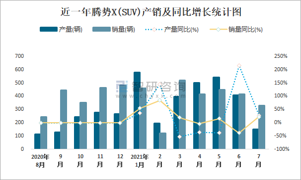根據(jù)中國(guó)汽車工業(yè)協(xié)會(huì)數(shù)據(jù)可知:2021年7月騰勢(shì)X(SUV)產(chǎn)量為149輛,同比增長(zhǎng)27.4%,銷量為330輛,同比增長(zhǎng)21.8%,當(dāng)月產(chǎn)銷率為221.48%;2021年1-7月騰勢(shì)X(SUV)累計(jì)產(chǎn)量為2769輛,同比下降15%,累計(jì)銷量為2713輛,同比增長(zhǎng)23.7%,累計(jì)產(chǎn)銷率為97.98%;且2020年騰勢(shì)X(SUV)總產(chǎn)量大于總銷量,積壓了庫(kù)存107輛。