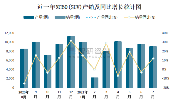 近一年XC60(SUV)產銷及同比增長統計圖