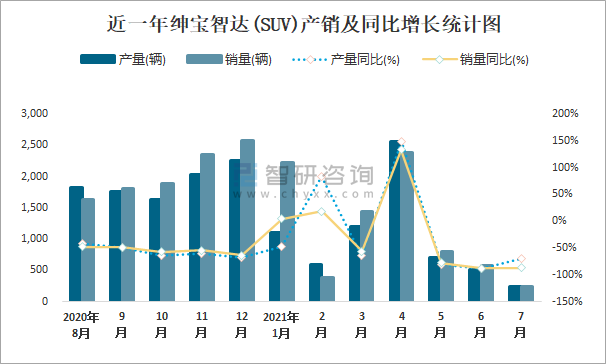 根據中國汽車工業協會數據可知:2021年7月紳寶智達(SUV)產量為249輛,同比下降68.9%,銷量為249輛,同比下降87.1%,當月產銷率為100%;2021年1-7月紳寶智達(SUV)累計產量為6932輛,同比下降55.8%,累計銷量為8064輛,同比下降48.9%,累計產銷率為116.33%;2018-2020年紳寶智達(SUV)銷量2019年跌至最低值,此后回升,2020年達到最高值,且近3年總銷量大于總產量,清倉庫存2475輛。