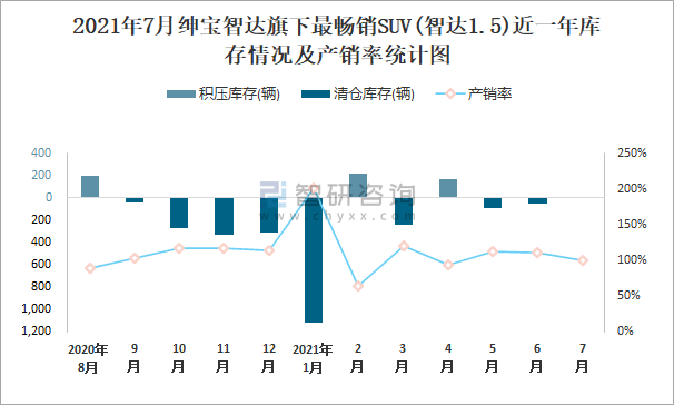 2021年7月紳寶智達旗下最暢銷SUV(智達1.5)近一年庫存情況及產銷率統計圖