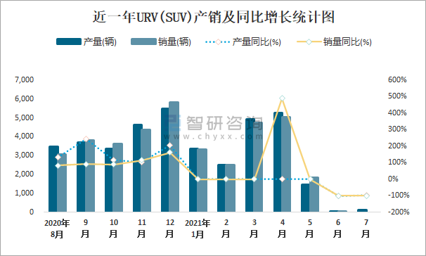 根據中國汽車工業協會數據可知:2021年7月URV(SUV)產量為106輛,同比下降97.4%,銷量為0輛,同比下降100%,當月產銷率為0%;2021年1-7月URV(SUV)累計產量為17638輛,同比增長107%,累計銷量為17510輛,同比增長104.4%,累計產銷率為99.27%;2017-2020年URV(SUV)產銷量均在2019年跌至最低值,此后小幅度回升,且近4年總產量大于總銷量,積壓了庫存51輛。