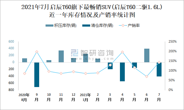 2021年7月啟辰T60旗下最暢銷SUV(啟辰T60二驅1.6L)近一年庫存情況及產銷率統(tǒng)計圖