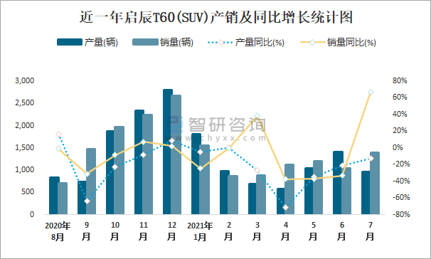 近一年啟辰T60(SUV)產銷及同比增長統(tǒng)計圖
