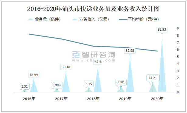 2016-2020年汕頭市快遞業務量及業務收入統計圖