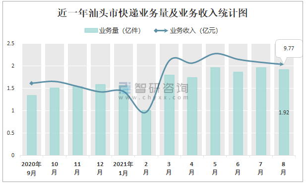 近一年汕頭市快遞業務量及業務收入統計圖