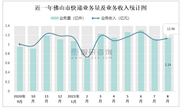 近一年佛山市快遞業(yè)務(wù)量及業(yè)務(wù)收入統(tǒng)計(jì)圖