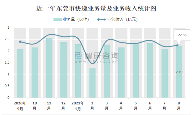 2021年8月東莞市快遞業(yè)務(wù)量與業(yè)務(wù)收入分別為21944.83萬(wàn)件和225846.9萬(wàn)元