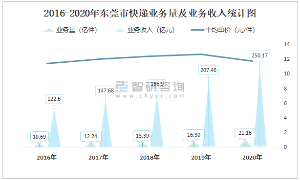 2016-2020年?yáng)|莞市快遞業(yè)務(wù)量及業(yè)務(wù)收入統(tǒng)計(jì)圖