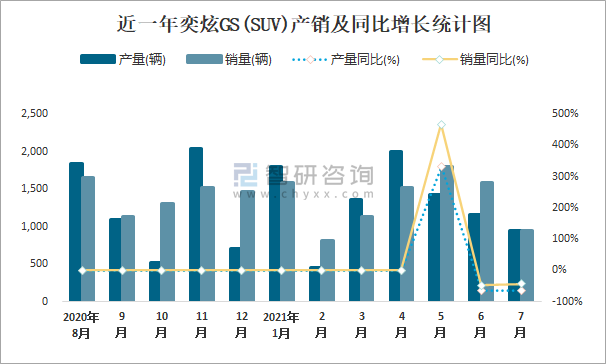 根據中國汽車工業協會數據可知:2021年7月奕炫GS(SUV)產量為949輛,同比下降62.6%,銷量為950輛,同比下降42.4%,當月產銷率為100.11%;2021年1-7月奕炫GS(SUV)累計產量為9153輛,同比增長46.9%,累計銷量為9387輛,同比增長84.7%,累計產銷率為102.56%;且2020年奕炫GS(SUV)總產量大于總銷量,積壓了庫存266輛。