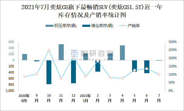 2021年7月奕炫GS旗下最暢銷SUV(奕炫GS1.5T)近一年庫存情況及產銷率統計圖
