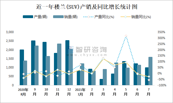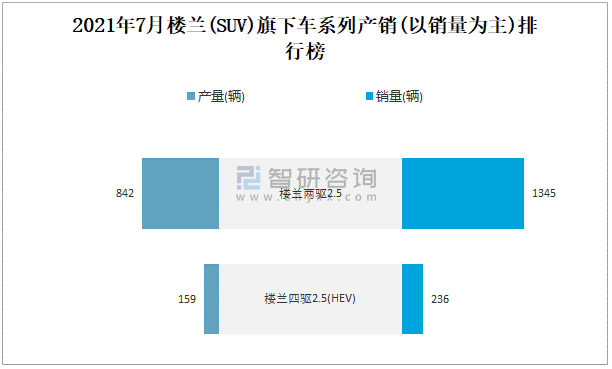 2021年7月樓蘭(SUV)產銷量分別為1001輛和1581輛 當月產銷率為157.94%