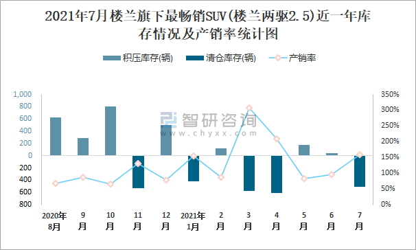 2021年7月樓蘭旗下最暢銷SUV(樓蘭兩驅2.5)近一年庫存情況及產銷率統計圖
