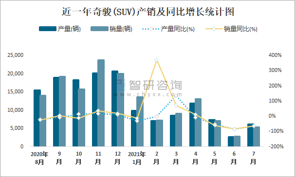 近一年奇駿(SUV)產(chǎn)銷及同比增長統(tǒng)計圖