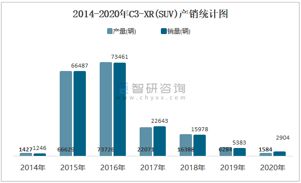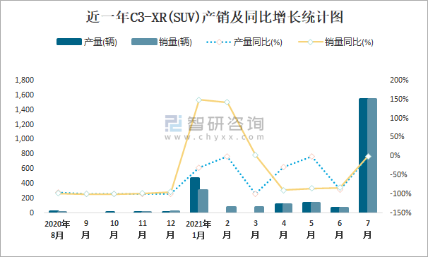 根據中國汽車工業協會數據可知:2021年7月C3-XR(SUV)產量為1546輛,同比下降0%,銷量為1542輛,同比下降0%,當月產銷率為99.74%;2021年1-7月C3-XR(SUV)累計產量為2348輛,同比增長52.2%,累計銷量為2344輛,同比下降18.1%,累計產銷率為99.83%;2014-2020年C3-XR(SUV)產銷量均在2016年達到最高值,此后逐年遞減,且近7年總產量大于總銷量,積壓了庫存7輛。
