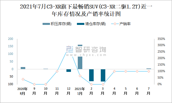 2021年7月C3-XR旗下最暢銷SUV(C3-XR二驅1.2T)近一年庫存情況及產銷率統計圖