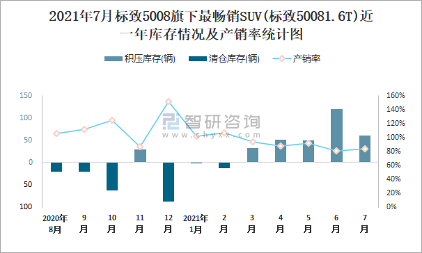 2021年7月標致5008旗下最暢銷SUV(標致50081.6T)近一年庫存情況及產銷率統計圖