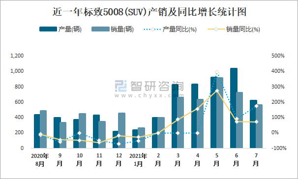 近一年標致5008(SUV)產銷及同比增長統計圖