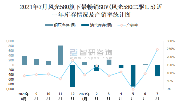 2021年7月風光580旗下最暢銷SUV(風光580二驅1.5)近一年庫存情況及產銷率統計圖