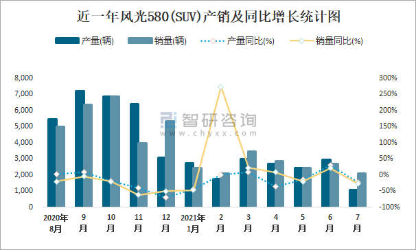 根據中國汽車工業協會數據可知:2021年7月風光580(SUV)產量為1071輛,同比下降23.4%,銷量為2100輛,同比下降26.3%,當月產銷率為196.08%;2021年1-7月風光580(SUV)累計產量為16607輛,同比下降10.5%,累計銷量為18034輛,同比下降3.5%,累計產銷率為108.59%;2016-2020年風光580(SUV)產銷量均在2017年達到最高值,此后逐年遞減,且近5年總產量大于總銷量,積壓了庫存1836輛。