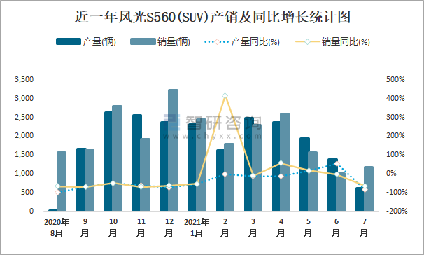 近一年風(fēng)光S560(SUV)產(chǎn)銷(xiāo)及同比增長(zhǎng)統(tǒng)計(jì)圖