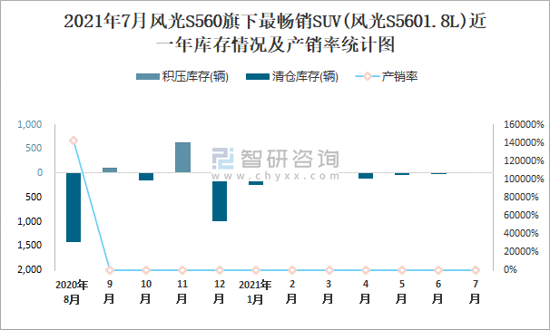2021年7月風(fēng)光S560旗下最暢銷(xiāo)SUV(風(fēng)光S5601.8L)近一年庫(kù)存情況及產(chǎn)銷(xiāo)率統(tǒng)計(jì)圖
